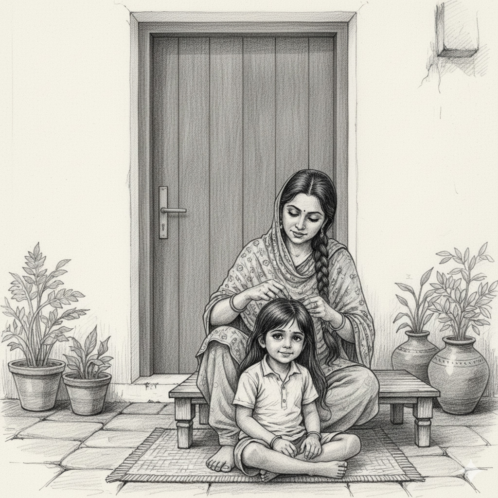 Outside it, on a raised concrete platform, sat a woman oiling and plaiting her child’s hair.
