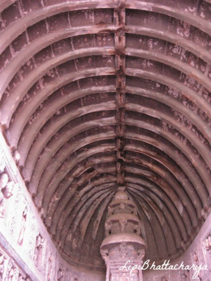 The ribbed roof is modeled in imitation of curving wooden timbers. According to an inscription here, the excavation of this cave was caused by Varahadeva, the minister of Vakataka king Harishena.