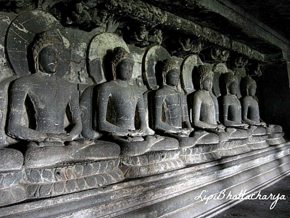 Upper hall of the Cave 12 has sculptures of seven seated Buddhas.