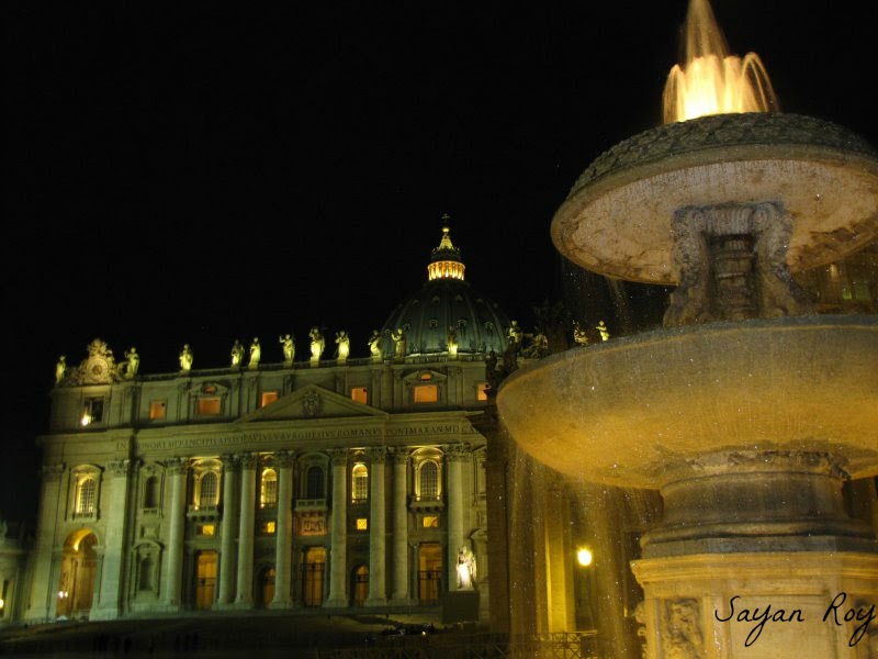 Night view of fountain and the grand east facade of St Peter’s Basilica