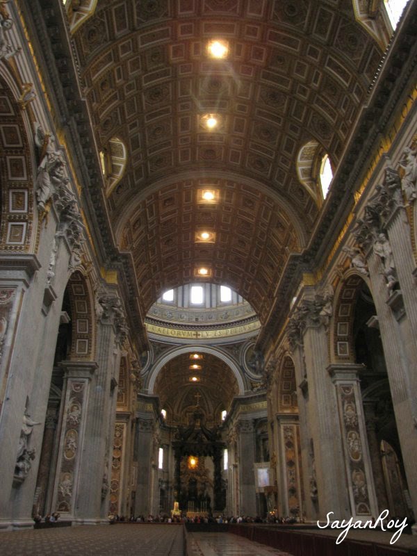 View down the central nave to the baldacchino and the yellow-windowed Cathedra of St. Peter, both by Bernini.